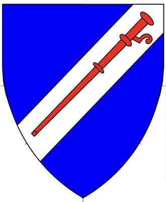 Azure, on a bend sinister argent a pilgrim's staff gules.