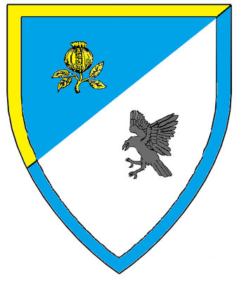Per bend sinister azure and argent, a pomegranate slipped and leaved Or and a raven rising sable, a bordure counterchanged Or and azure. |
